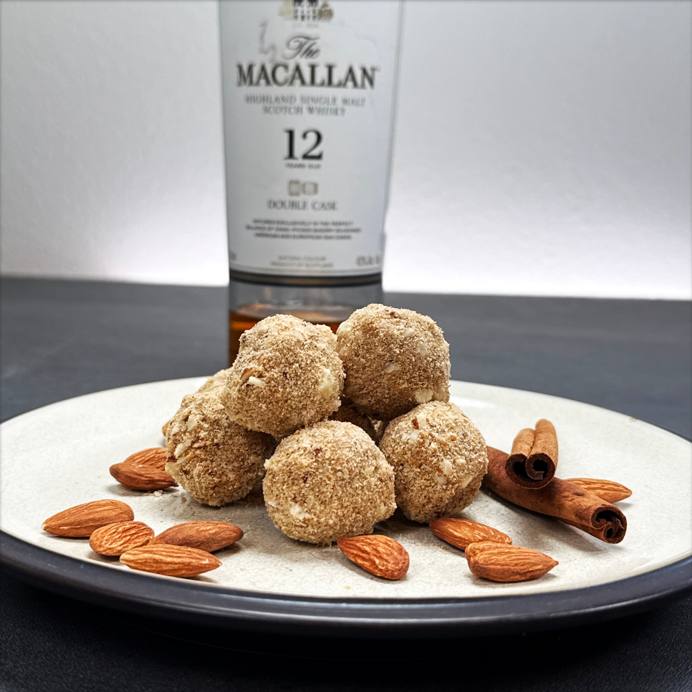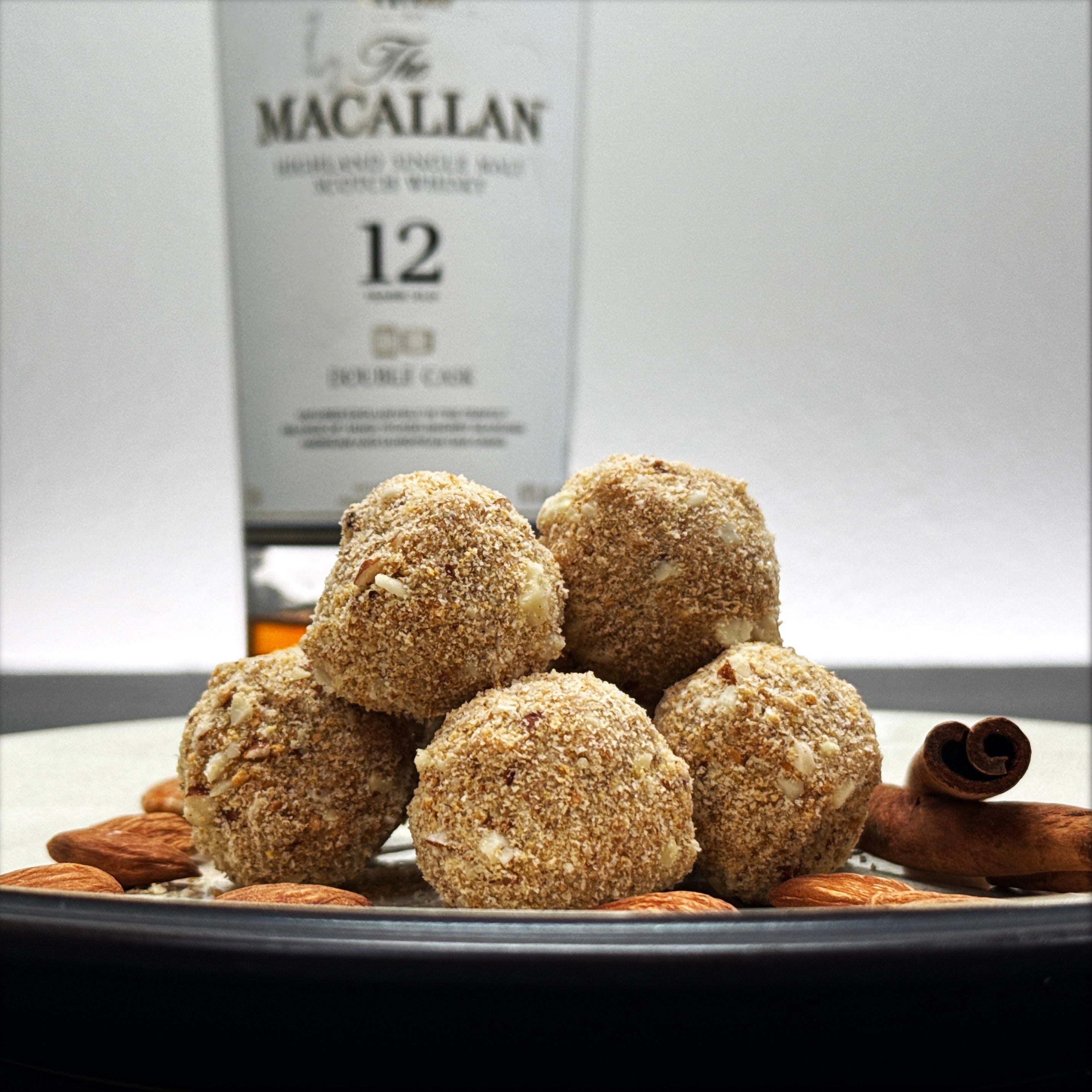 These decadent treats start with tender almond butter cake. Add in toasted almonds, a touch of cinnamon and a healthy pour of Macallan 12 year Scotch, which is buttery smooth in it's own right (and not too smoky). Why not the good stuff -- you're worth it! Then it's all enrobed in almond-graham crumb.